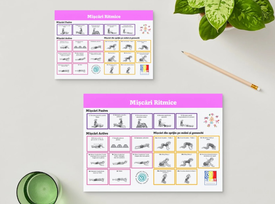 Conceptul de postere BRMT sunt o unealta de ajutor a terapeutilor in timpul sedintelor de terapie. Prin alegerea dimensiunii dorite (A4, A3 sau A2) in functie de locul ideal in care vor fi afisate, posterele ne ghideaza in efectuarea miscarilor ritmice si a etapelor pe care dorim sa le urmarim atunci cand lucram.